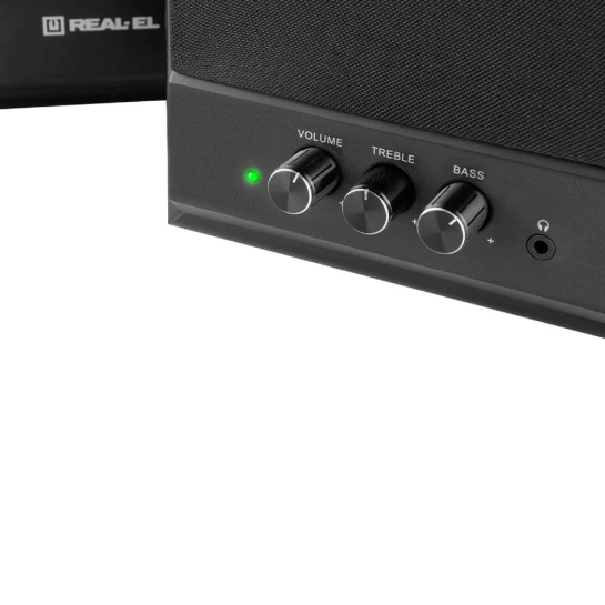 REAL EL S-305 оснащені зручними елементами управління, включаючи регулятори гучності, низьких і високих частот, а також дистанційне управління, що додає комфорту у використанні. Ці функції дозволяють легко налаштовувати звук відповідно до ваших уподобань, забезпечуючи ідеальне звучання для будь-якого випадку.