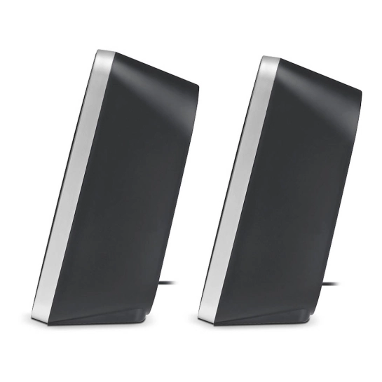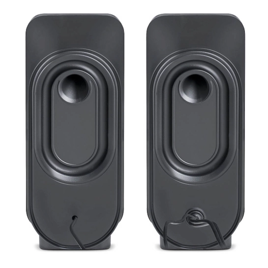 Колонки виконані в класичному мінімалістичному стилі. Матова чорна поверхня корпусу візуально легка і не марка, а компактна форма дозволяє розмістити акустику навіть на вузькому столі або під монітором. Невеликі сріблясті або глянцеві вставки надають системі сучасний акцент. Така конструкція буде доречною як в офісі, так і в домашньому інтер'єрі.