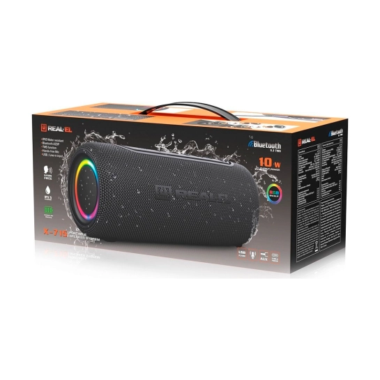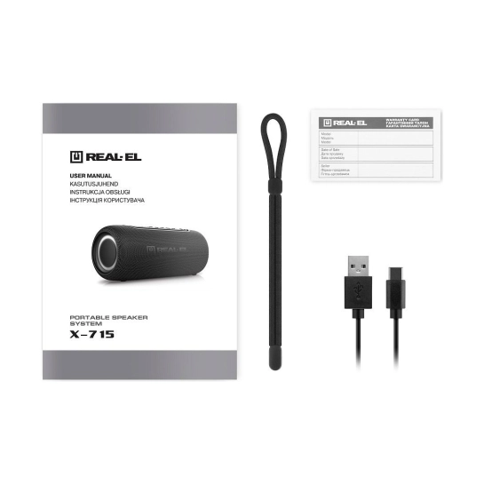 REAL-EL X-715 - це 10 Вт потужного стереозвуку, до 10 метрів дії Bluetooth, до 10 годин автономної роботи, зручна зарядка через USB Type-C і вага всього 750 г. Створена, щоби звучати з тобою скрізь!
