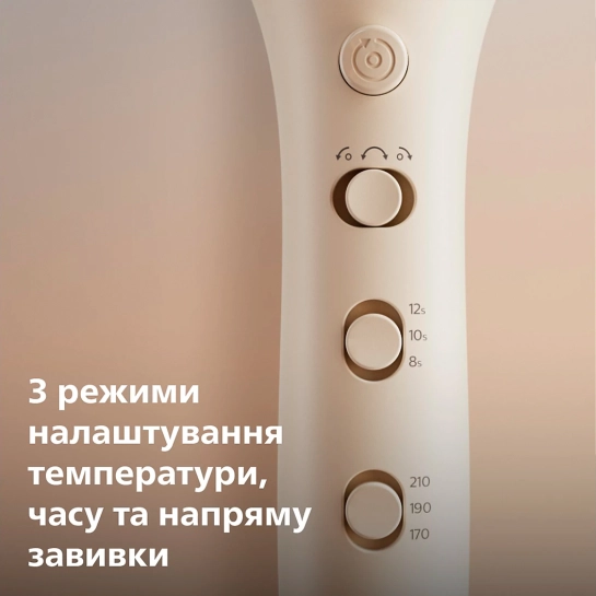 Завжди досягайте бажаного образу - від м'яких хвиль до пружних кучерів. Вибирайте температуру 170, 190 або 210 °C для завивки пасм протягом 8, 10 або 12 секунд.