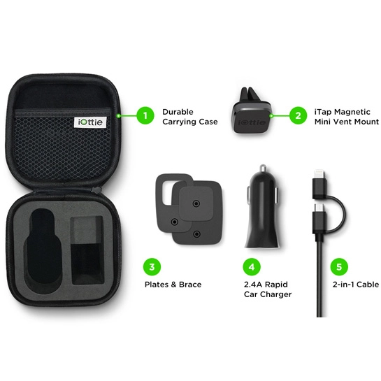 iOttie Charging Travel Kit - це відмінний набір для автовласників, що включає в собі міцний чохол для транспортування, магнітне кріплення, металеві пластини, автомобільний зарядний пристрій і сертифікований MFI кабель 2-в-1 для зарядки Lightning і мікро-USB.