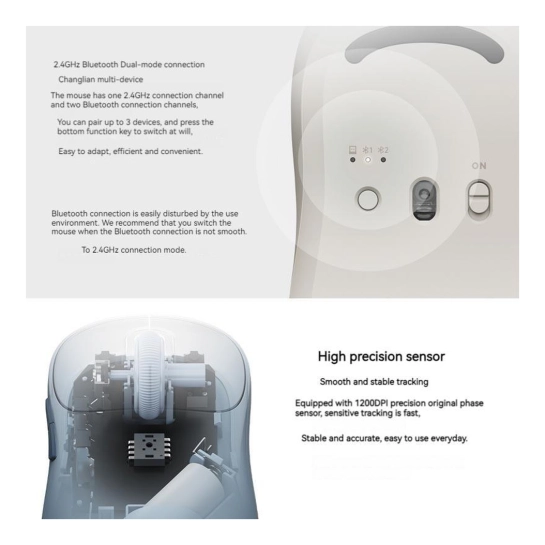 Миша має один канал бездротового з'єднання 2,4 ГГц і два канали Bluetooth, що дозволяє під'єднати до 3 пристроїв. Швидко і просто перемикайтеся між ними, натискаючи функціональну кнопку внизу.