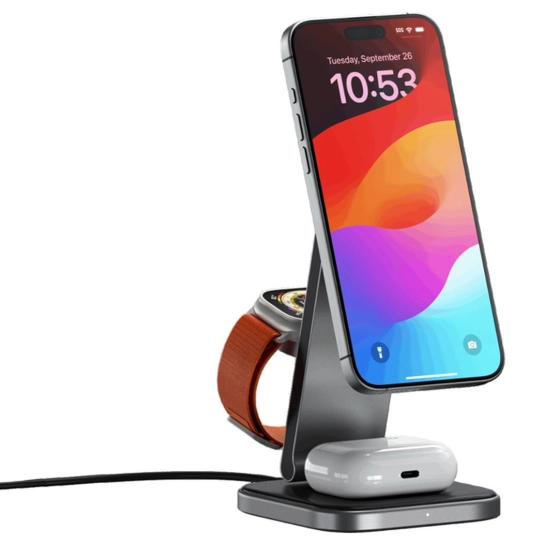 Бездротовий зарядний пристрій Satechi 3-in-1 Foldable Qi2 Stand Space Gray