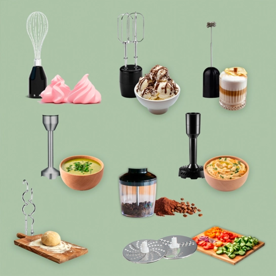 В комплект входять 6 найпопулярніших насадок: занурювальна насадка, спінювач молока, подрібнювач, насадки для збивання, насадка для пюре та кавомолка.