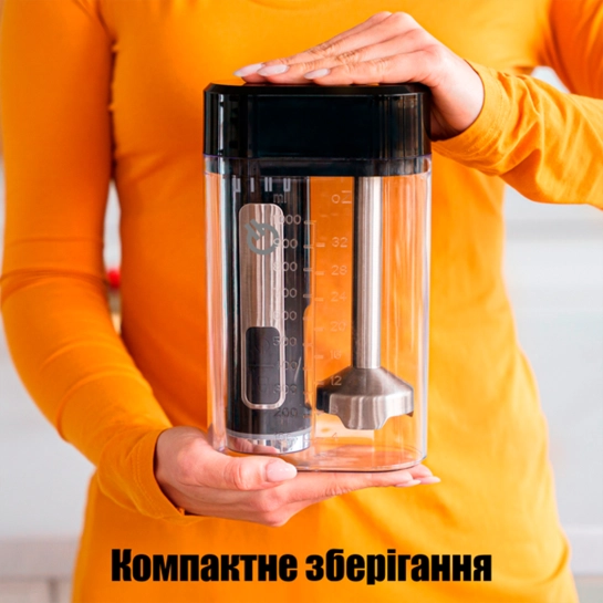 А склянка-контейнер служить не тільки мірною ємністю, а й використовується як контейнер для компактного зберігання блендера.