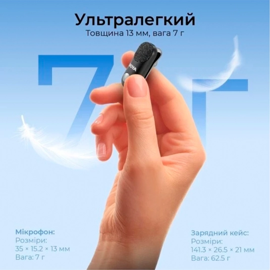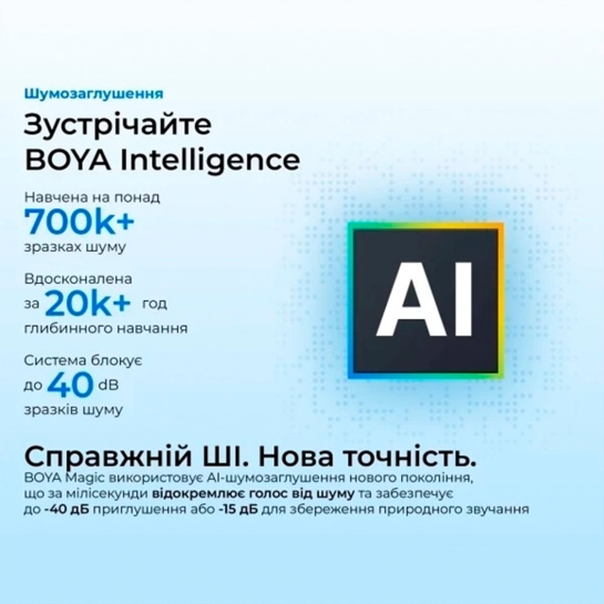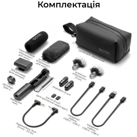 Система BOYA MAGIC оснащена шумоподавником з ІІ, тому ви можете працювати і в ідеальних студійних умовах, і в шумних приміщеннях, і на вулиці, навіть за наявності вітру (у комплекті є вітрозахист і для мікрофона-стику, і для петличних мікрофонів).
