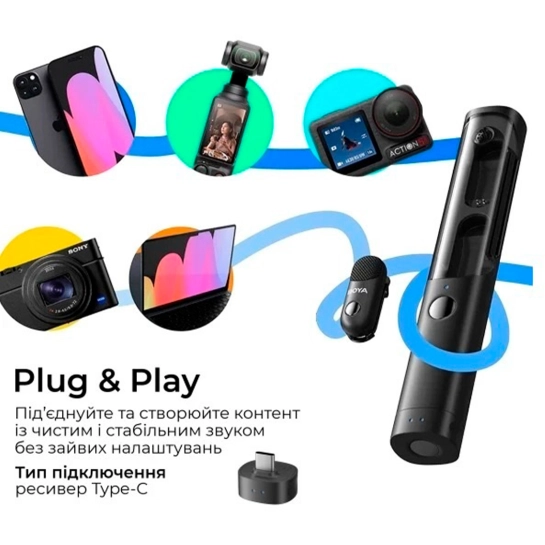 BOYA MAGIC не вимагає налаштувань, проводів або підключення – просто натисніть кнопку на кейсі, і система моментально готова до запису.