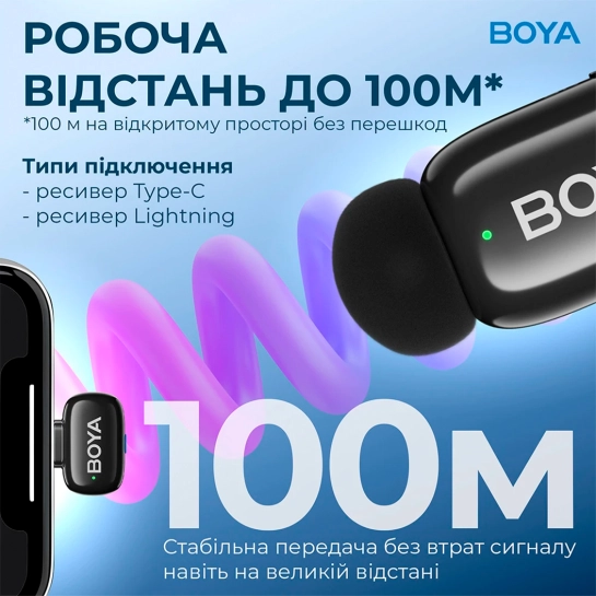Це повноцінний бездротовий мікрофон із радіозв'язком, а не просто петличка на шнурі. Радіус дії до 100 метрів дозволяє спокійно відходити від камери, ходити по кімнаті, знімати динамічні сцени або відео без прив'язки до штативу. Зв'язок стабільний у звичайних умовах зйомки - звук залишається синхронним з картинкою, навіть якщо ви повертаєтеся спиною або відходите всередину приміщення. Такий формат зручний для блогерів, тренерів, репетиторів та всіх, хто часто рухається у кадрі.