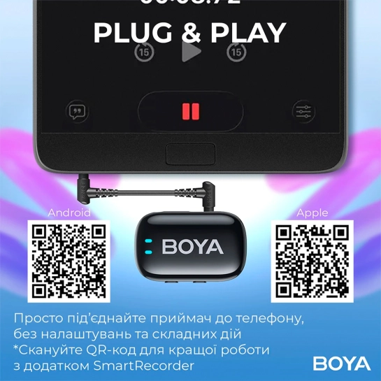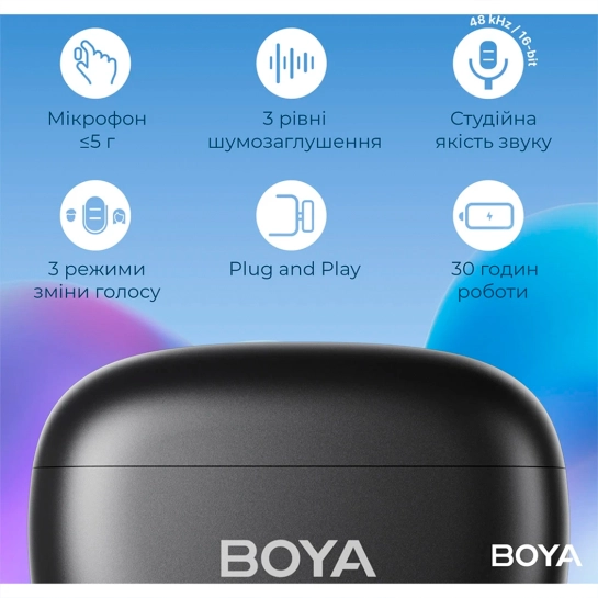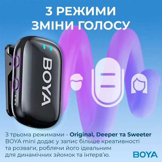 BOYA Mini відмінно підходить для створення контенту, інтерв'ю, блогів, подкастів, стриму та онлайн-ігор. Він поєднує в собі високу якість звуку, простоту підключення та максимальну мобільність.