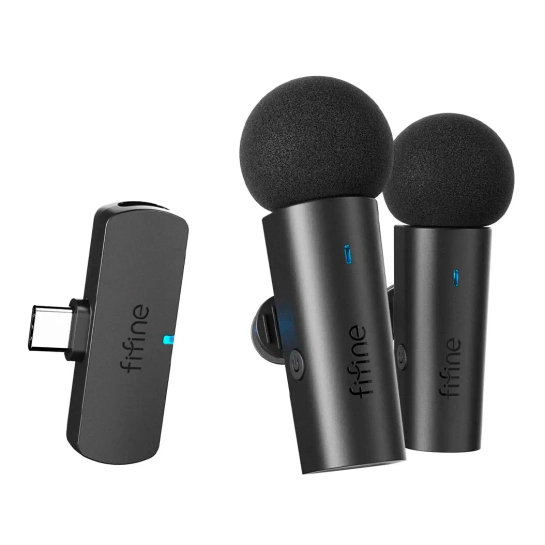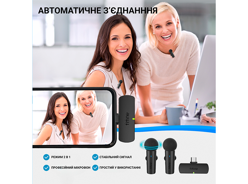 Fififne M8 – універсальний петельний бездротовий мікрофон, сумісний із телефонами Android через USB Type-C порт та з iPhone через перехідник. Автономний час роботи до 6 годин без перерви.