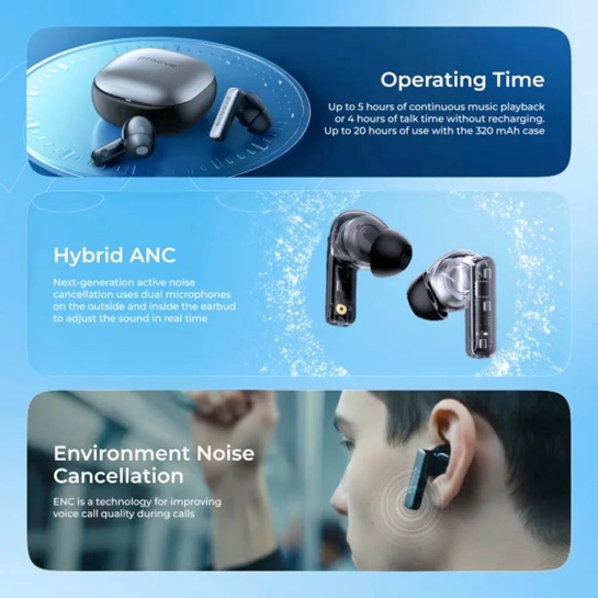 Гібридний ANC використовує зовнішні та внутрішні мікрофони для точного придушення шуму. Зовнішні фіксують навколишні звуки, а внутрішні усувають залишкові вібрації у вушному каналі. Такий підхід ефективно знижує шум транспорту, вулиці та офісного простору, зберігаючи природність і чистоту відтворення. Додатково передбачено режим прозорості для ситуацій, коли важливо чути навколишній світ.