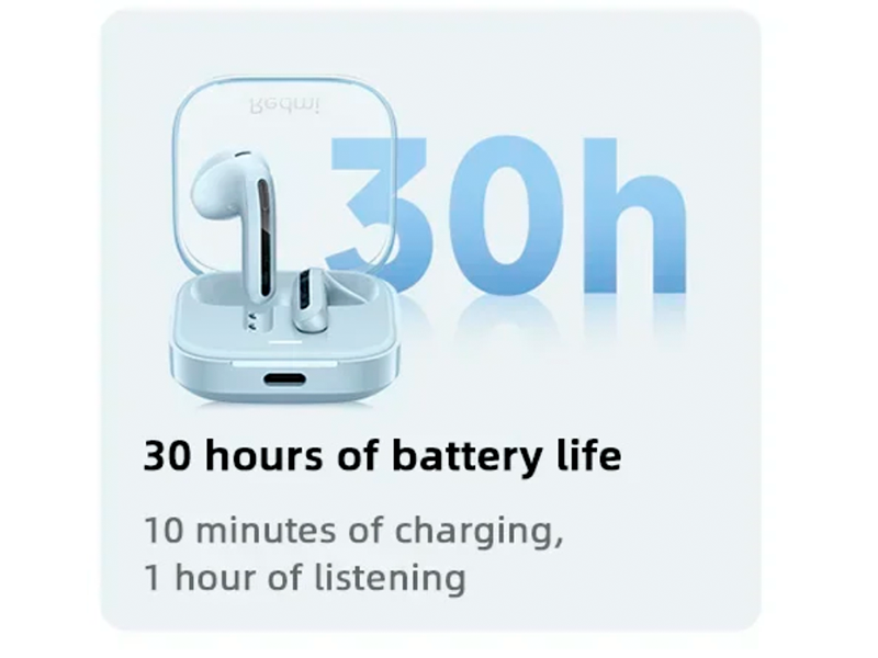 На одному заряді навушники Redmi Buds 6 Active здатні відтворювати музику до 6 годин, з урахуванням ресурсу зарядного кейсу час автономної роботи зростає до 30 годин, а це один із найкращих показників у галузі. Несподівано скінчився заряд? Усього 10 хвилин підзарядки - і у вас є ще до 1 години відтворення.