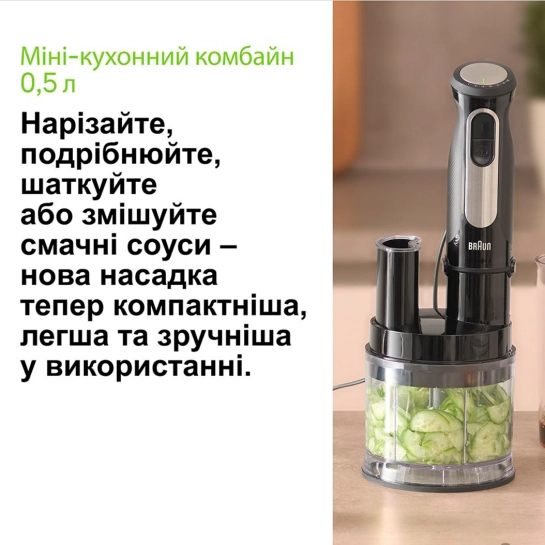 Менший, легший та надзвичайно простий у використанні. З новим кухонним міні-комбайном (0,5л) ви можете заощадити простір, не жертвуючи функціональністю.