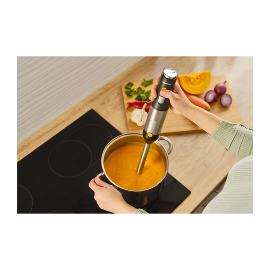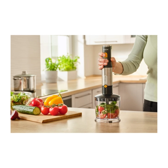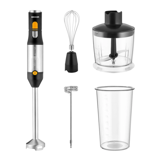 Блендер Sencor SHB6302BK - потужний та багатофункціональний кухонний помічник, створений для швидкого та ефективного приготування улюблених страв. Завдяки потужності 1200 Вт він легко подрібнює, змішує, збиває та виконує інші кулінарні завдання. Модель поєднує 5 функцій в 1 — блендер, вінчик, подрібнювач, спінювач молока та міксер. Чотири леза з нержавіючої сталі забезпечують ідеальну консистенцію інгредієнтів, а плавне регулювання швидкості дозволяє точно контролювати процес. У комплект входять чаша об'ємом 800 мл, подрібнювач на 500 мл, вінчик та насадка для спінювання молока - все необхідне для приготування соусів, кремів, смузі та кавових напоїв. Корпус у стильному чорному кольорі та ергономічна ручка роблять використання комфортним, а металева занурювальна ніжка довжиною 20 см дозволяє працювати навіть із гарячими продуктами.