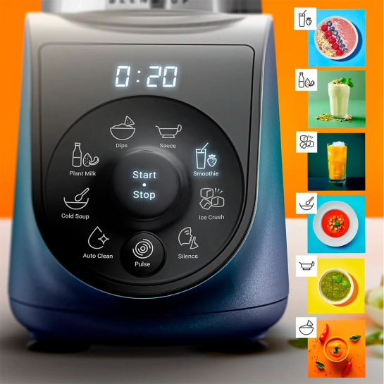 8 автоматичних програм забезпечують оптимальну швидкість та час змішування для ідеальної текстури смузі, рослинних напоїв, соусів та супів-пюре.