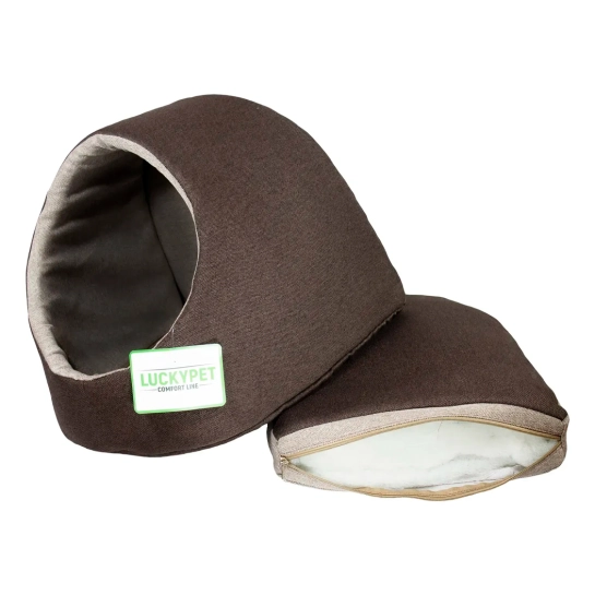 Виріб відмінно тримає форму завдяки якісному наповнювачу, а чохол будиночка виконаний із міцної тканини – рогожки . Завдяки щільному переплетенню ниток, матеріал має високу міцність і зносостійкість, добре пропускає повітря, не викликає алергії і не вбирає неприємні запахи, створюючи максимальний комфорт вашому вихованцю під час відпочинку.