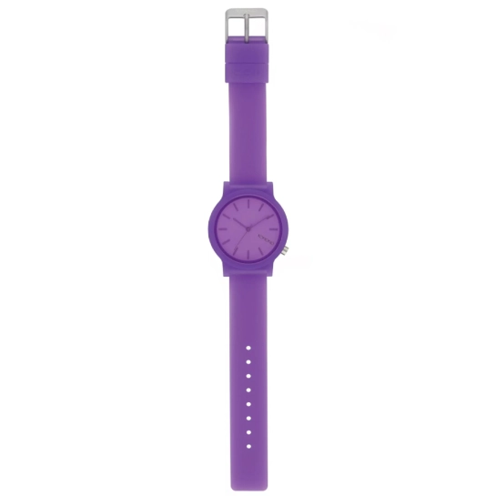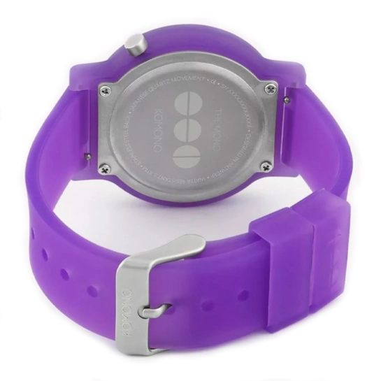 Годинник Mono Purple Glow від бельгійського бренду KOMONO - мінімалістичний і одночасно незвичайний і унікальний. Корпус годинника з полікарбонату, а задня кришка з нержавіючої сталі. Циферблат без зайвих деталей, тільки лаконічні насічки та лого бренду. Захищений високоякісним мінеральним склом. Механізм надійний, японський кварцовий. Модель має легкий клас водонепроникності 5 АТМ – годинник витримує потрапляння під дощ, в них можна помити руки, але перед душем краще зняти. Годинник доповнює силіконовий ремінець у колір корпусу із системою легкої заміни.