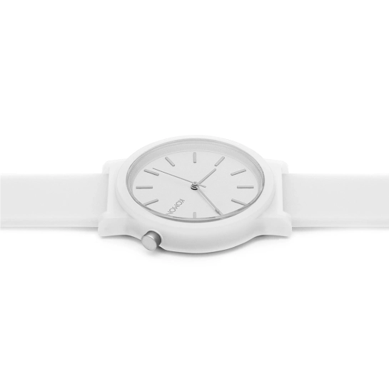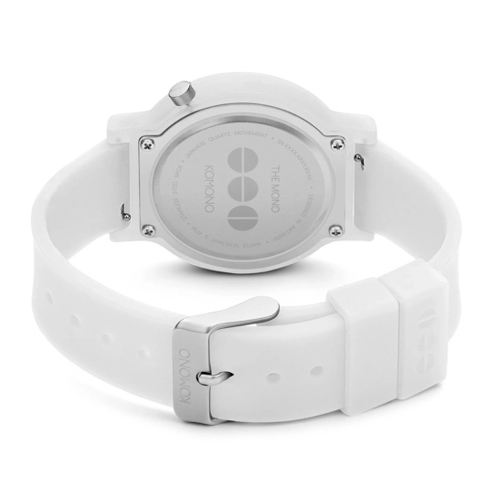 Годинник Mono White Glow від бельгійського бренду KOMONO - мінімалістичний і одночасно незвичайний і унікальний. Корпус годинника з полікарбонату, а задня кришка з нержавіючої сталі. Циферблат без зайвих деталей, тільки лаконічні насічки та лого бренду. Захищений високоякісним мінеральним склом. Механізм надійний, японський кварцовий. Модель має легкий клас водонепроникності 5 АТМ – годинник витримує потрапляння під дощ, в них можна помити руки, але перед душем краще зняти. Годинник доповнює силіконовий ремінець у колір корпусу із системою легкої заміни.
