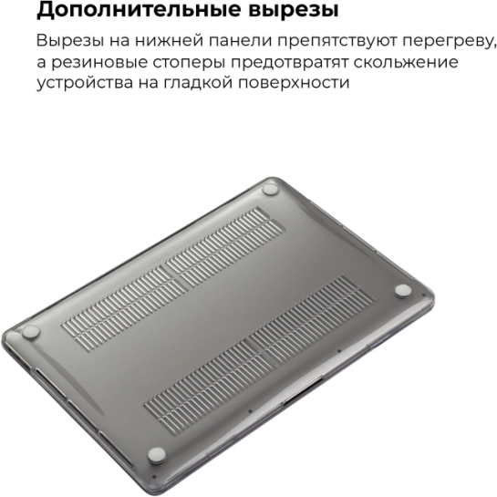 Міцний полікарбонат захищає ноутбук від подряпин, легких ударів та забруднень. Чохол покриває верхню та нижню частини пристрою, залишаючи отвори для вентиляції та ніжки для стійкості.