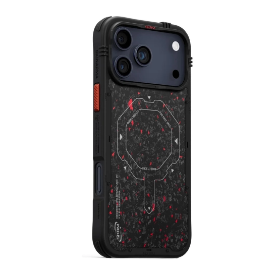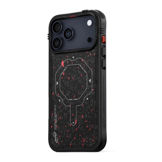 Вперед до мети з VEKTOR. Чотиристоронній захисний чохол із задньою панеллю з кованого вуглецевого волокна з червоними вкрапленнями та магнітним кільцем для бездротової зарядки. Можливість індивідуального налаштування завдяки змінним кутовим накладкам з петлями для ремінця, що дозволяють носити чохол на зап'ясті.