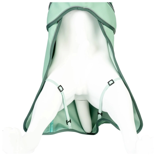 Дощовик має широкий виріз горловини, що робить процес одягання та знімання швидким і простим, не викликаючи дискомфорту у собаки. Еластичний регульований шнурок на шиї дозволяє індивідуально підігнати розмір під конкретного вихованця для комфортної посадки. Регульований ремінь на животі та еластичні регульовані петлі на лапах забезпечують надійну фіксацію виробу та ідеальну посадку навіть при активних рухах і сильному вітрі.
