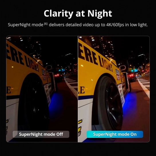Завдяки більшому сенсору, вдосконаленій оптиці та ефективному шумоподавленню, режим SuperNight дозволяє отримувати чисті та чіткі нічні відео до 4K/60 кадр/с. Навіть при мінімальному освітленні зображення зберігає деталізацію та природні кольори.