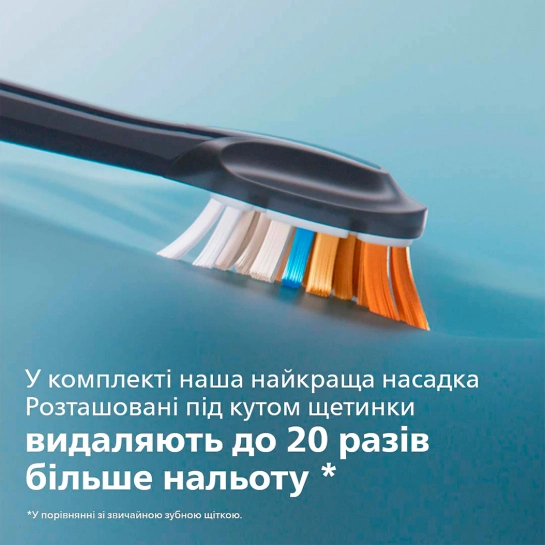 Кожен чистить зуби по-різному, тому ми створили цю насадку з щетинками, розташованими під різним кутом, щоб видалення нальоту було найбільш ефективним незалежно від техніки чистки. Наша чистяча насадка All-in-One A3 забезпечує кращі показники чищення і допоможе вам видаляти наліт до 20 разів ефективніше, покращить здоров'я ваших ясен в 15 разів за 6 тижнів, а також на 100% ефективніше видалить потемніння вже за два дні відносно звичайної зубної щітки.