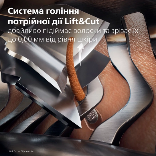 Наша запатентована система Lift & Cut потрійної дії дбайливо піднімає волоски від кореня і точно зрізає їх на висоті до 0,00 мм від рівня шкіри для більш тривалого ефекту гладкого гоління.