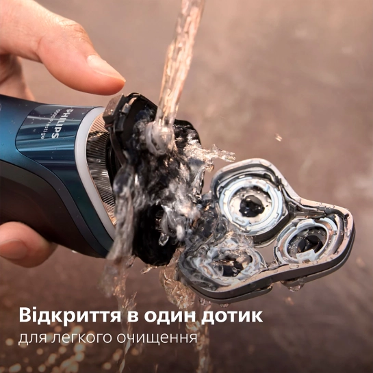Легке та швидке очищення електробритви: натисніть на кнопку, відкрийте голівку для гоління і промийте водою.