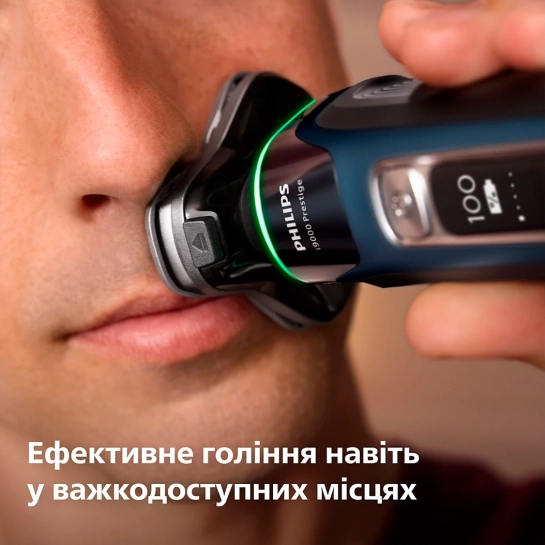 Гнучкі та компактні головки з принципом розтягування шкіри адаптуються під кожний контур вашого обличчя. Щільний контакт зі шкірою та на 20% більш висока точність збривання волосків навіть у важкодоступних ділянках шиї та під носом. максимальна точність.