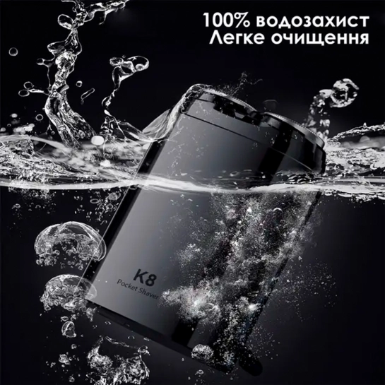 - 100% водонепроникність: Голитися можна навіть під душем! K8 Mini-Shave повністю водонепроникна, що забезпечує легкість у догляді та можливість миття під проточною водою.