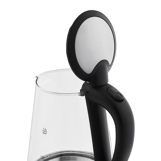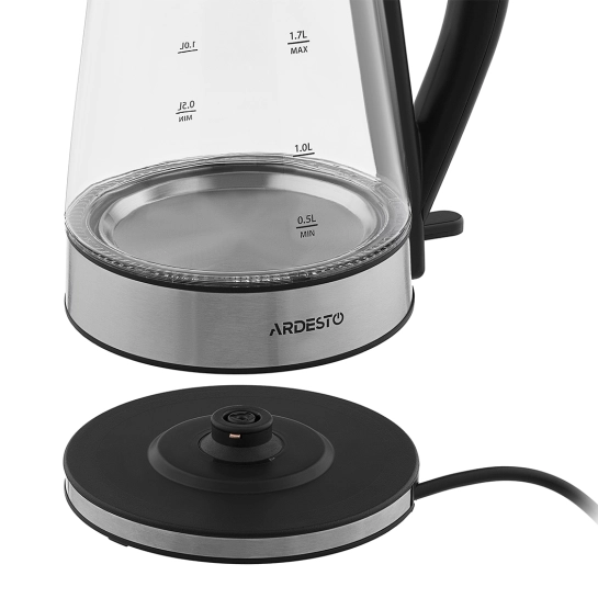 Фільтр накипу легко миється, а для комфортного використання зручна ручка з кнопкою відкриття кришки. За включення відповідає окрема кнопка, розташована в нижній частині чайника. Довжина дроту підставки становить 80 см. Робота чайника супроводжується LED-підсвічуванням синього кольору. Нагрівальний елемент - прихований.