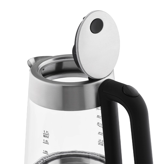 Для комфортного використання є зручна ручка із кнопкою відкриття кришки. За включення відповідає окрема кнопка, розташована в нижній частині чайника. Довжина дроту підставки становить 80 см. Робота чайника супроводжується LED-підсвічуванням синього кольору. Нагрівальний елемент - прихований.
