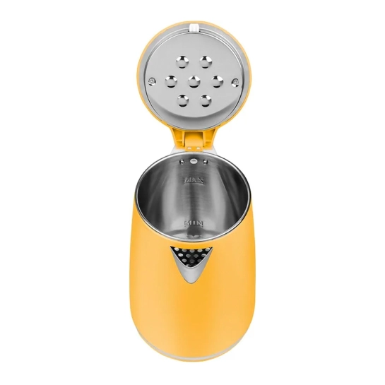 Бездротовий чайник із двошаровим корпусом із нержавіючої сталі та термостійкого пластику закип'ятить 2 л води менш ніж за 7 хвилин. Дисковий нагрівальний елемент з нержавіючої сталі простий у догляді і не піддається корозії.