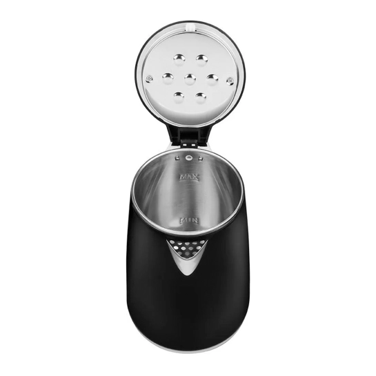 Бездротовий чайник із двошаровим корпусом із нержавіючої сталі та термостійкого пластику закип'ятить 2 л води менш ніж за 7 хвилин. Дисковий нагрівальний елемент з нержавіючої сталі простий у догляді і не піддається корозії.