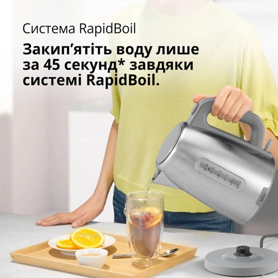 Завдяки технології RapidBoil чайник здатний довести до кипіння 200 мл води всього за 45 секунд. Це зручно для швидкого приготування чаю, кави або інших гарячих напоїв.