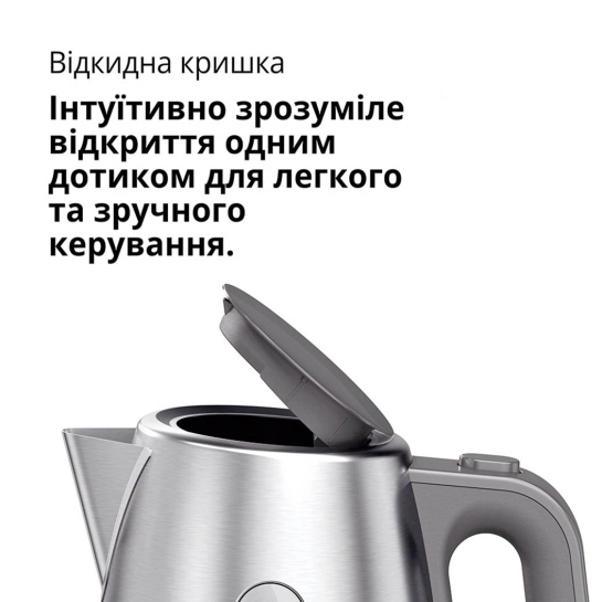 Кришка відкривається легким натисканням — однією рукою. Така конструкція робить наповнення чайника максимально комфортним і безпечним.