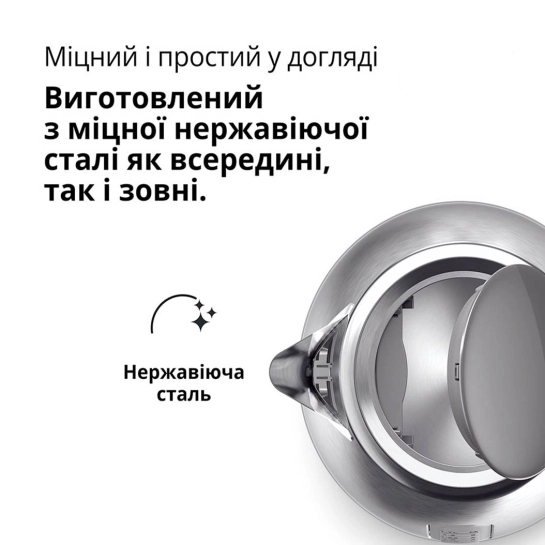 Чайник виготовлений з високоякісної нержавіючої сталі всередині та зовні. Матове металеве покриття не лише виглядає естетично, а й відрізняється стійкістю до пошкоджень та зносу, гармонійно вписуючись у сучасний інтер’єр.
