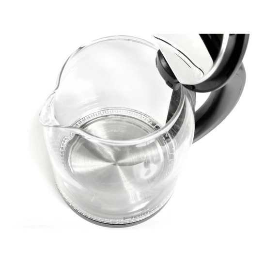 Корпус цього чайника виготовлений з високоякісного термостійкого скла в поєднанні з чорними пластиковими елементами, що створює елегантний зовнішній вигляд і дозволяє легко контролювати рівень води. Скляна "чаша" робить пристрій візуально легким і мінімалістичним, а внутрішня конструкція виглядає естетично під час кип'ятіння.