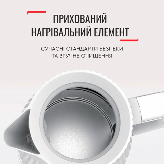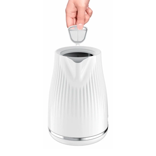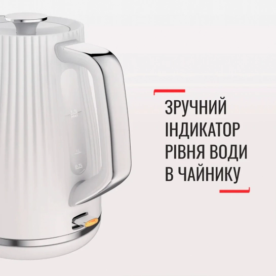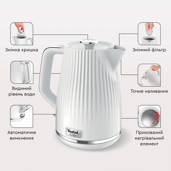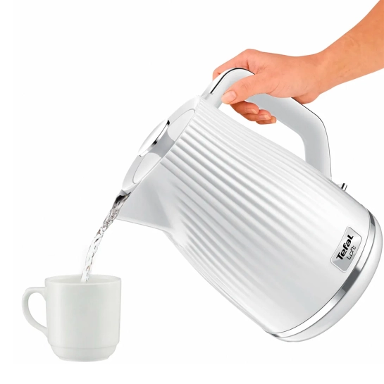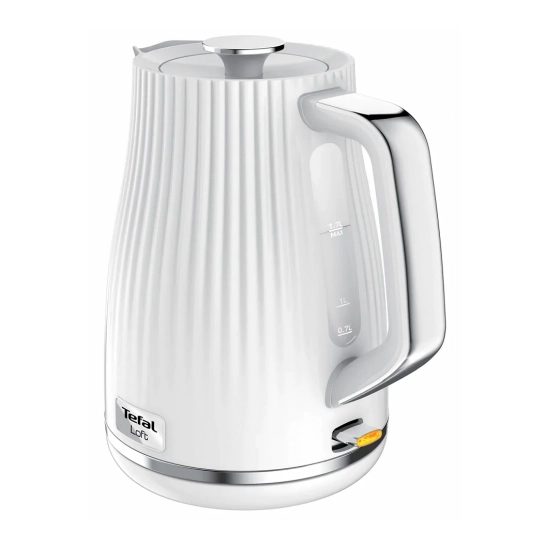Tefal KO250830 ємністю 1,7 літра. На корпусі з боку рукоятки нанесена шкала контролю рівня води в чайнику. Ручка закритої форми із хромованими естетичними вставками. Управління приладом механічне, за допомогою зручної клавіші увімкнення/вимкнення, що знаходиться під ручкою. Кришка повністю знімається. Крім стильного дизайнерського рішення має практичне значення: покращує доступ до внутрішньої частини електроприладу. Це робить налив води комфортнішим, а також спрощує чищення.