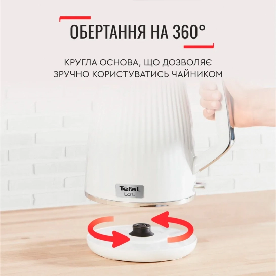 Електричний чайник Tefal KO250830 встановлюється на круглу основу. Така форма дозволяє надійно фіксувати чайник у будь-якому положенні з розворотом 360 градусів. Фільтр від накипу знімний. При знятті колби з бази пристрій автоматично вимикається.