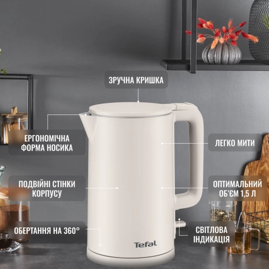 Електрочайник Tefal Thermo Protect — це поєднання елегантного дизайну, продуманої ергономіки та надійного захисту від перегріву. Модель представлена в декількох вишуканих кольорах, ідеально вписуючись у сучасний інтер'єр кухні. Корпус з термостійкого пластику не нагрівається зовні, що забезпечує комфорт і безпеку використання навіть для сімей з дітьми.