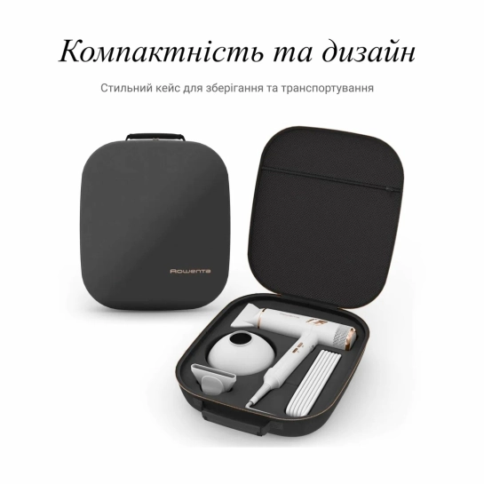 Преміальний кейс для зберігання та транспортування входить до комплекту та перетворює фен Rowenta Maestria на повноцінний професійний набір стиліста.