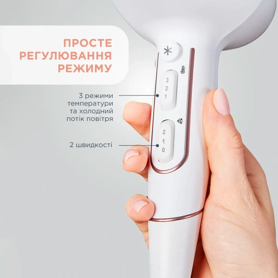 легко регулюйте швидкість обдування та нагрівання, досягаючи кращих результатів. Перемикайтеся між трьома варіантами температури та двома швидкісними режимами, підбираючи ваші потреби та стан волосся.