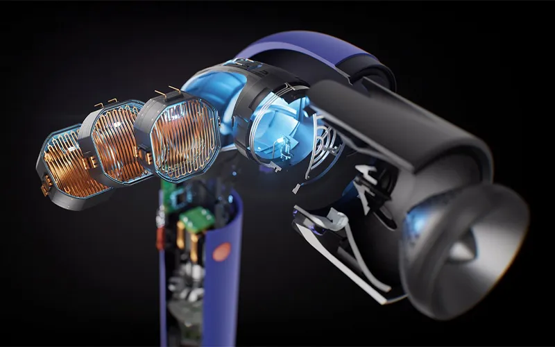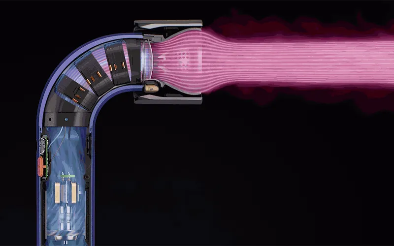 Двигун Dyson Hyperdymium створює потік повітря під високим тиском для швидкого сушіння, обертаючись зі швидкістю до 110 000 об/хв та формуючи струмінь контрольованого повітря.