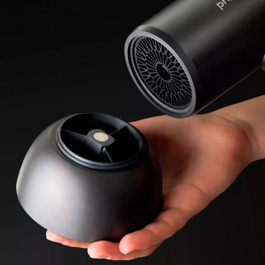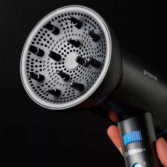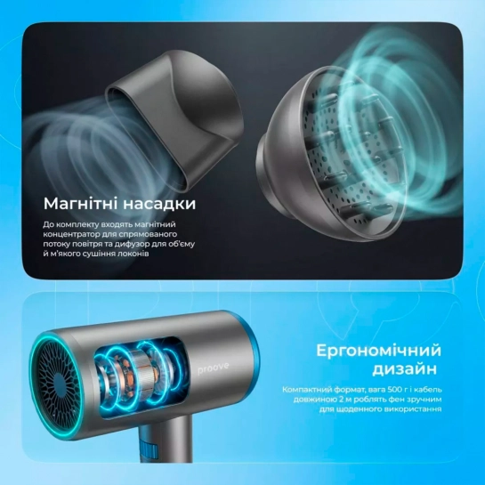 Фен отримав сучасний корпус з продуманою ергономікою та біокерамічними гратами вентилятора, що сприяє рівномірному розподілу тепла. Магнітні насадки легко встановлюються та надійно тримаються під час використання.