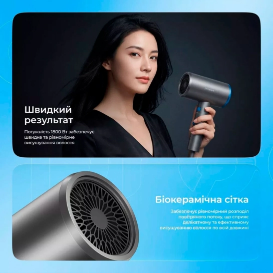 Потужність 1800W забезпечує швидке сушіння волосся, а іонізація повітря допомагає зменшити статичну електрику і зробити волосся гладкішим. Плавне регулювання потоку повітря дозволяє точно налаштувати інтенсивність під різні типи волосся.