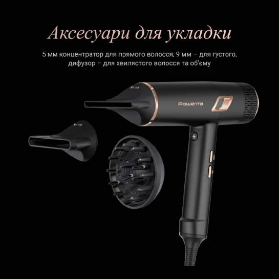 - 9-мм концентратор — для швидкого висушування та роботи з жорстким або густим волоссям;