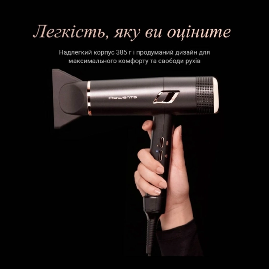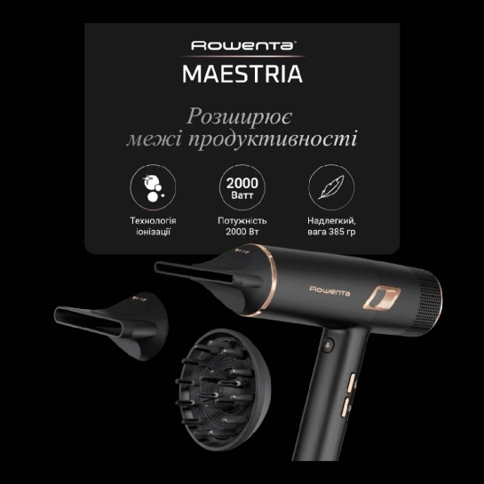Вага всього 385 г робить Maestria одним із найлегших професійних фенів. Ергономічна форма забезпечує комфортне використання — незалежно від того, чи створюєте ви об’єм біля коренів, сушите густе волосся чи формуєте локони.