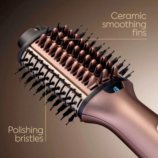 Широка овальна щітка продумана для максимально ефективної взаємодії з волоссям будь-якого типу. Щетинки з епоксидними кінчиками та м’які щетинки одночасно розплутують і полірують пасма, надаючи їм природний блиск. Керамічні та силіконові елементи сприяють рівномірному випрямленню, бережно розгладжують структуру волосся та допомагають досягти салонного результату навіть у домашніх умовах.